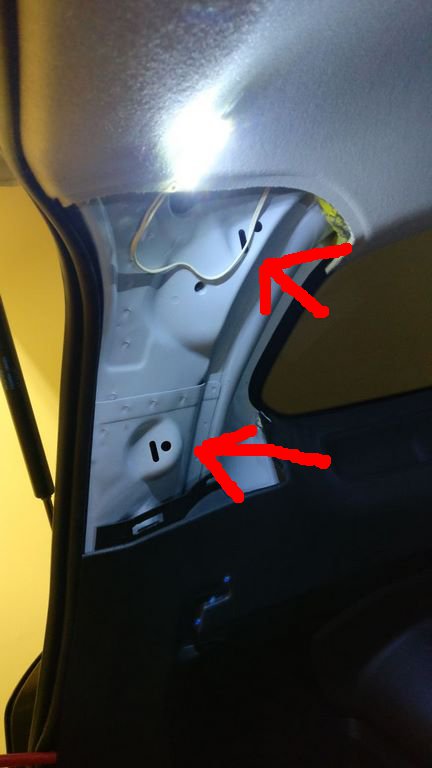 3. Quitar los plásticos superiores que cubren los parantes traseros (en mi modelo son color clarito). Para hacerlo hay que ayudarse con un destornillador plano para hacer palanca ya que están colocados a presión. En la imagen se muestra el lugar donde están los anclajes a presión.