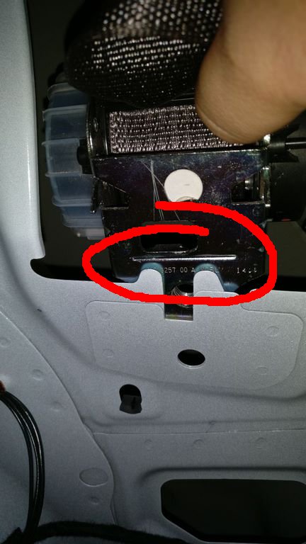 6. Colocar el sistema de enrollado del cinturón en la pared lateral de la carrocería. Cada juego de cinturones inerciales tienen su lado, no son intercambiables. En mi caso, un cinturón tenía una etiqueta "E" y otra "D". Se me ocurre que E de ESQUERDA y D de DIREITA en portugues. Dicho esto, los cinturones calzan de una sola manera para que funcionen correctamente. Cada carrete tiene una pestaña (adjunto imagen) que se coloca en la ranura para tal fin en la chapa de la carrocería.