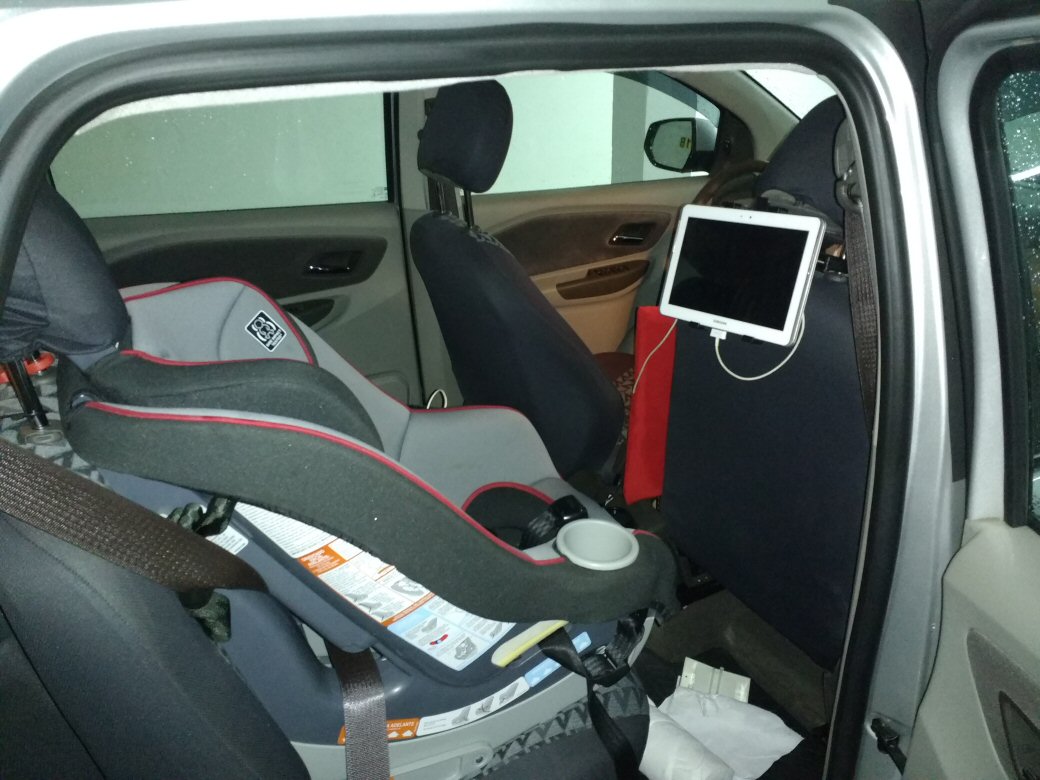 Yo lo que hice es comprar un soporte para tablets con agarre para las dos columnas del respaldo. En mi caso lo que me resulta útil es que puedo usar la tablet tanto dentro como fuera del auto y aparte como vivo en Capital Federal no puedo dejar nada dentro del auto que invite la mirada de los amigos de lo ajeno. Cuando el nene sea más grande supongo que me resultará más útil algo como lo que has hecho.
